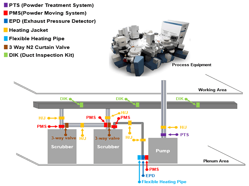 PMS can solve clogging issue when byproducts are formed during the semiconductor and FPD process by shooting out hot N2 into exhaust lines.